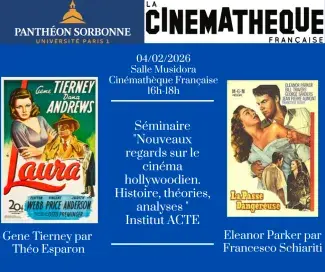 Conférences de Théo Esparon et Francesco Schiariti, organisées dans le cadre du séminaire « Nouveaux regards sur le cinéma hollywoodien. Histoire, théories, analyses » (Institut ACTE, Université Paris 1 Panthéon-Sorbonne), avec pour thème ce semestre « Politique des actrices ».